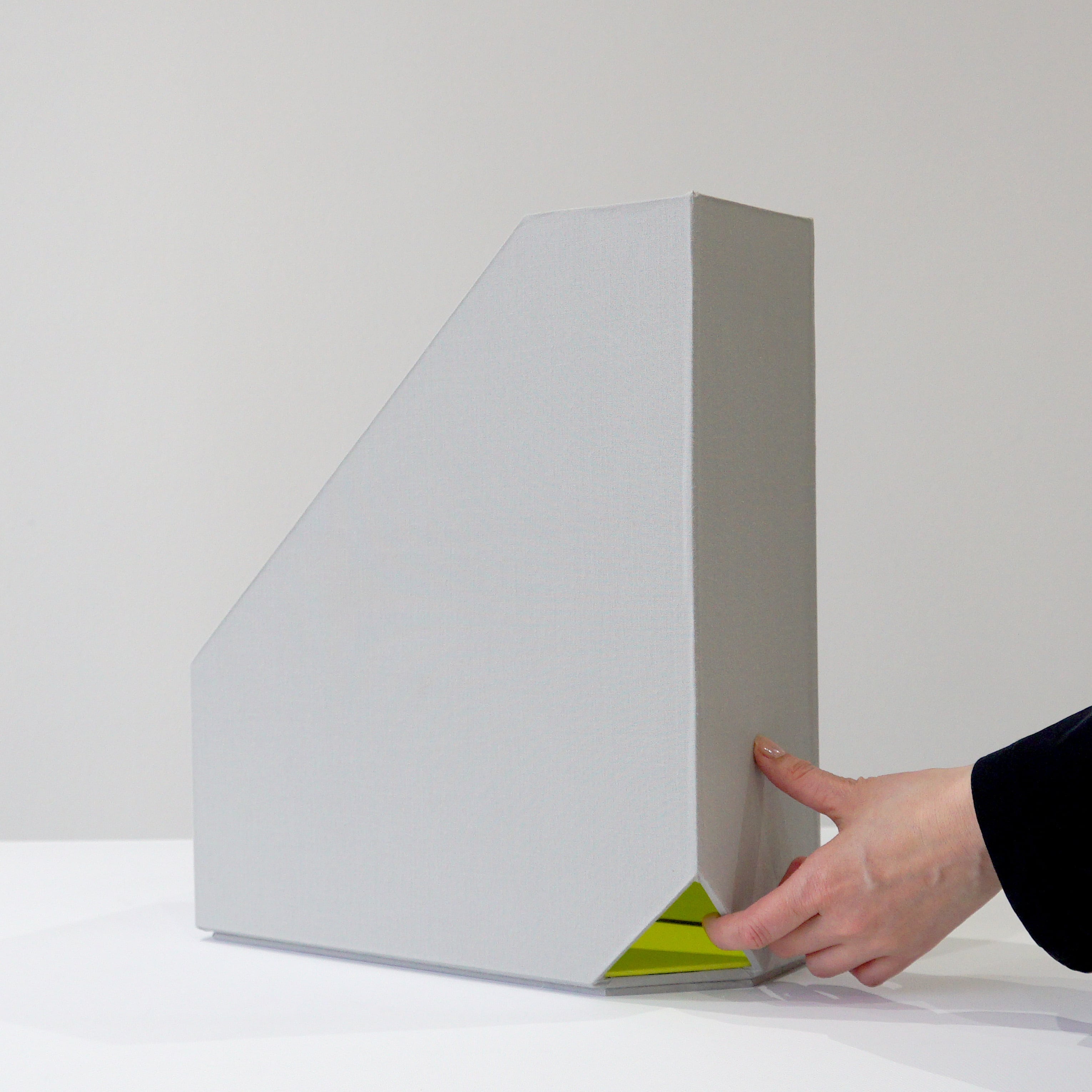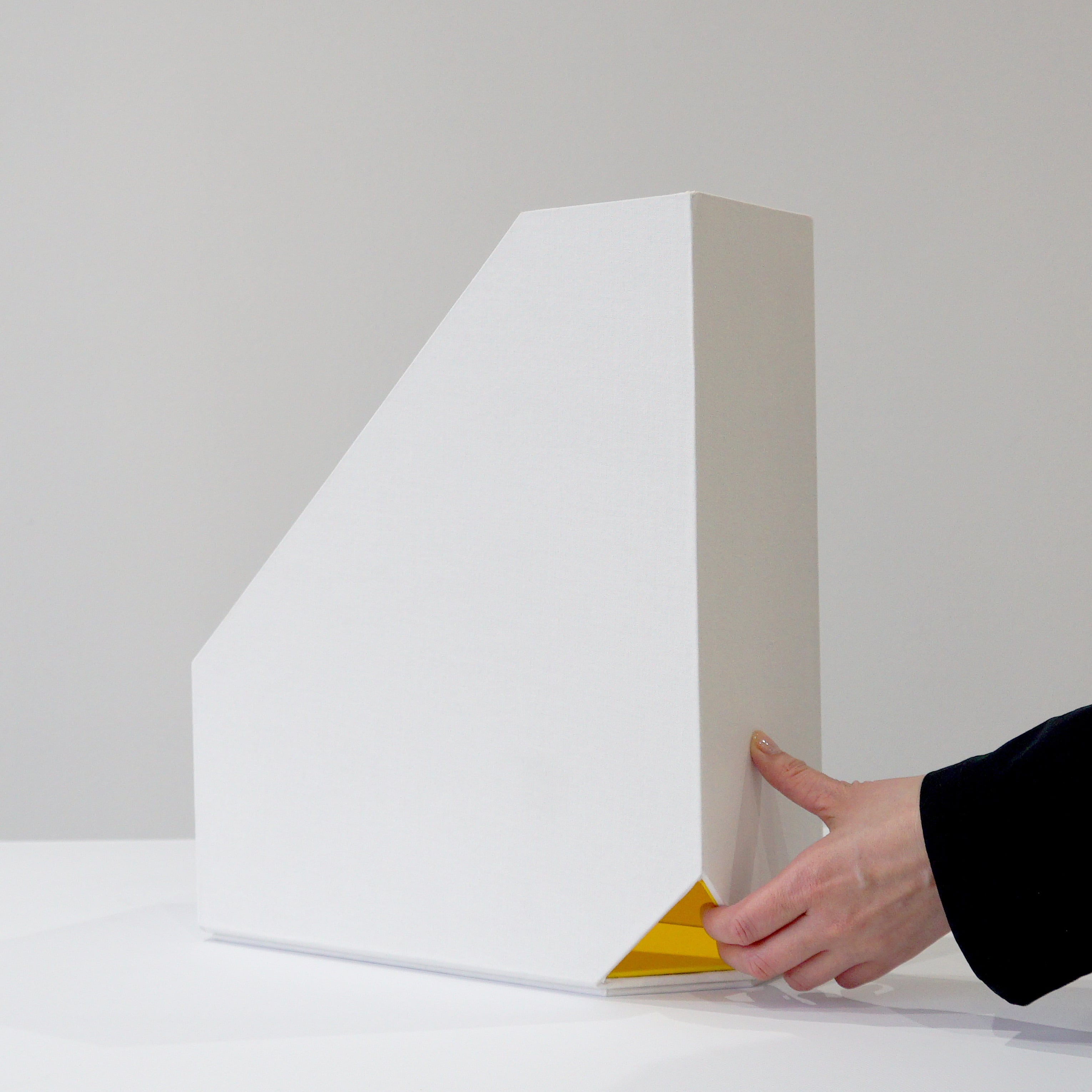 斜めカットの穴に呼びを引っ掛けやすいボックスファイル