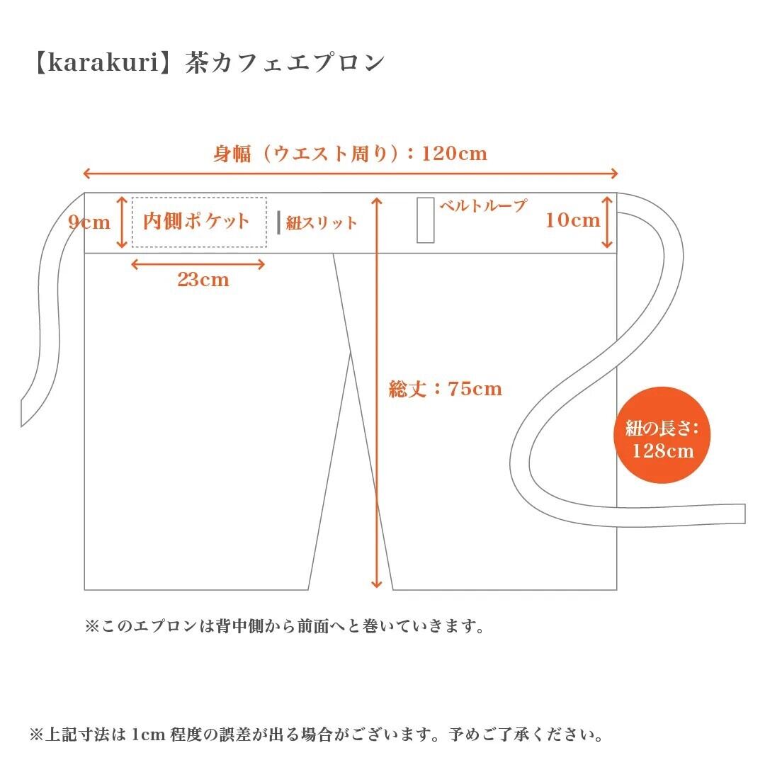 茶カフェエプロンは背中側から全面へと巻く形状のため、前と後ろをしっかりとカバーしてくさます