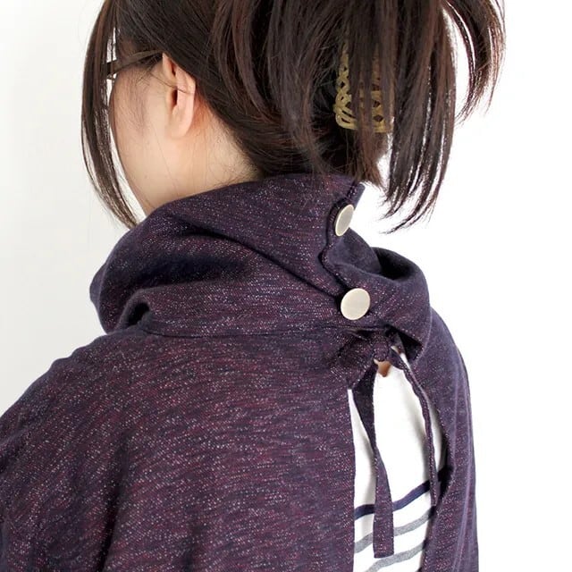 着物にも合わせられるように背中は紐で止め、ボタン止も襟とゴム止の袖を使って簡単アレンジができます