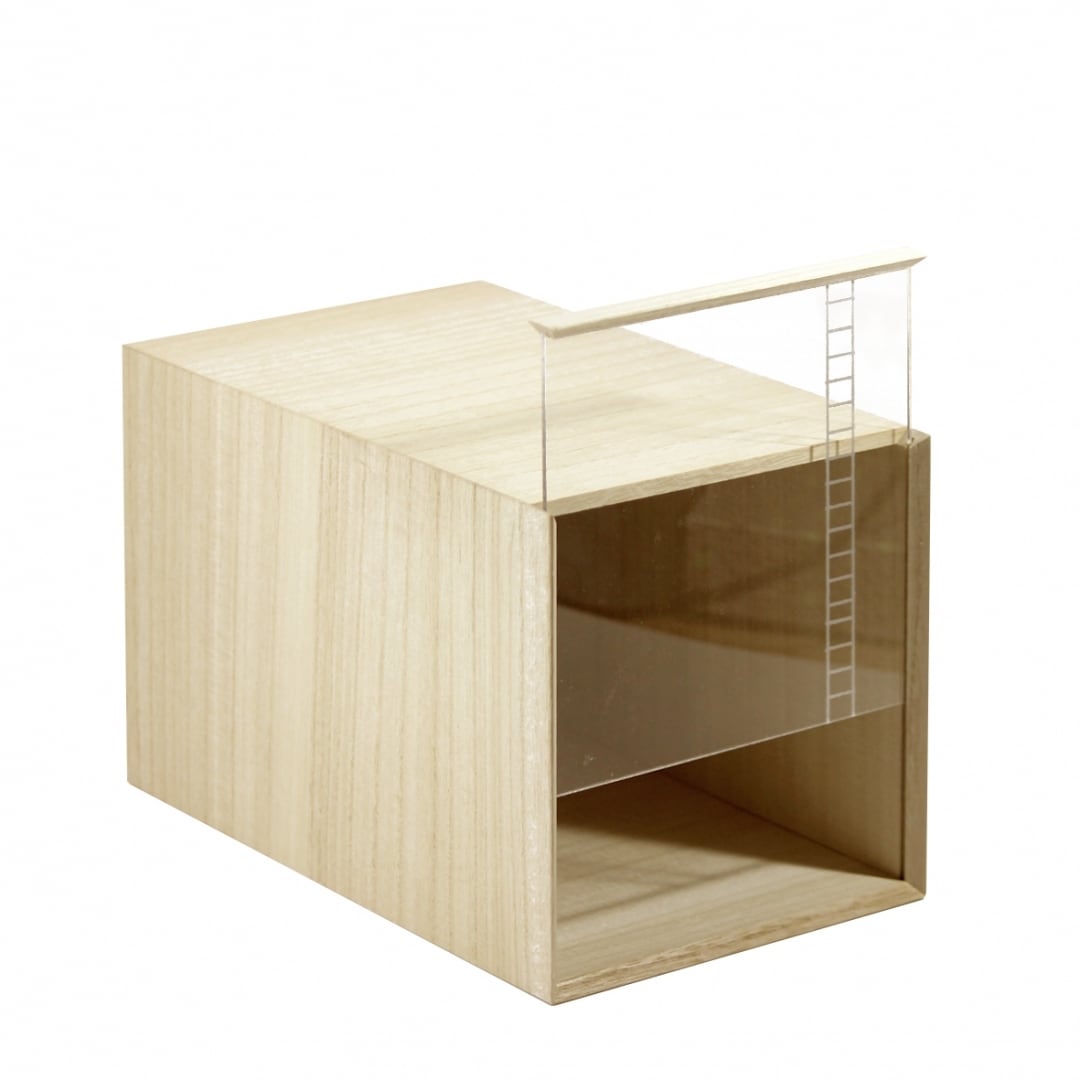 透明なアクリルの落とし蓋に"はしご"の銀箔押しがある収納です