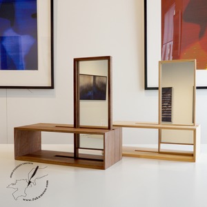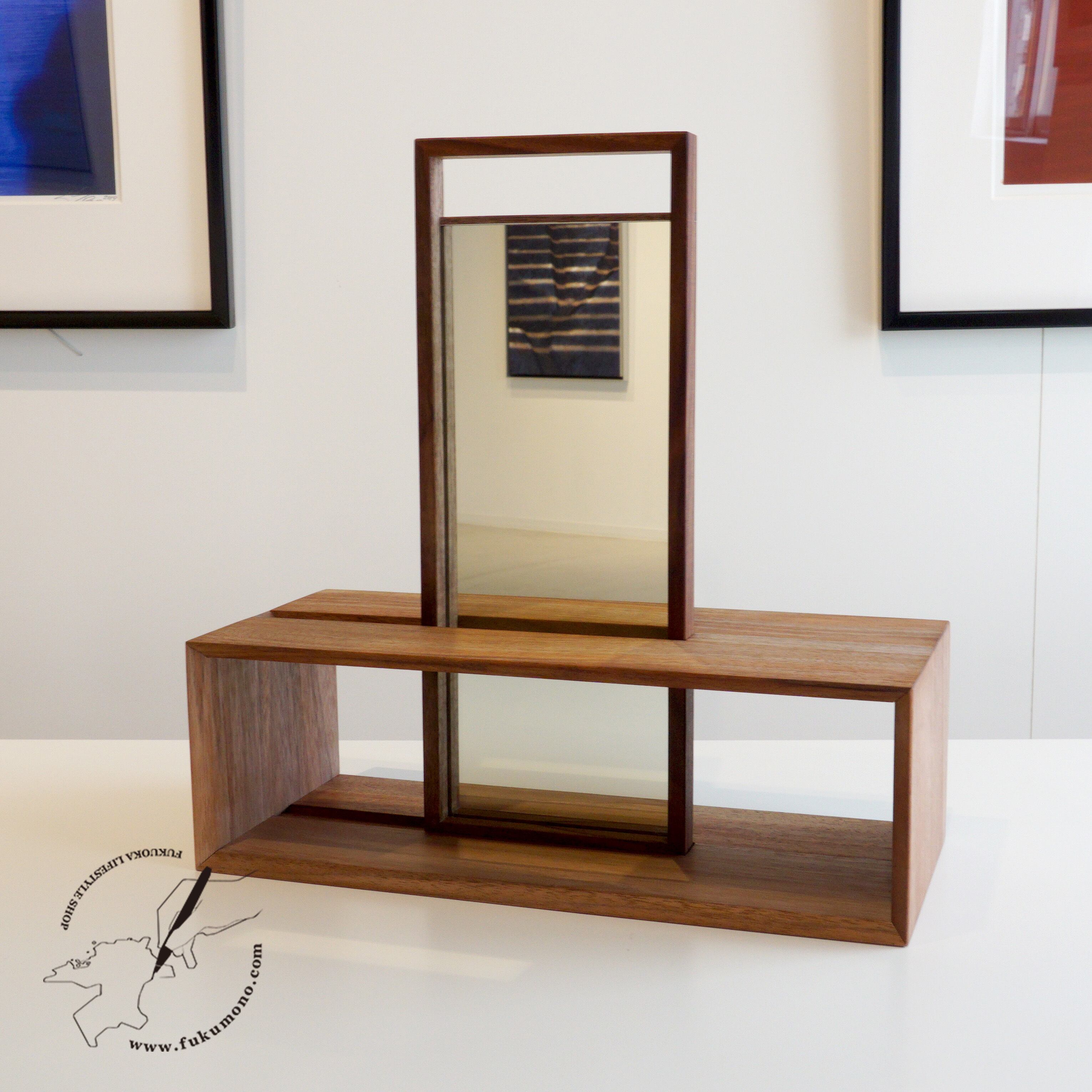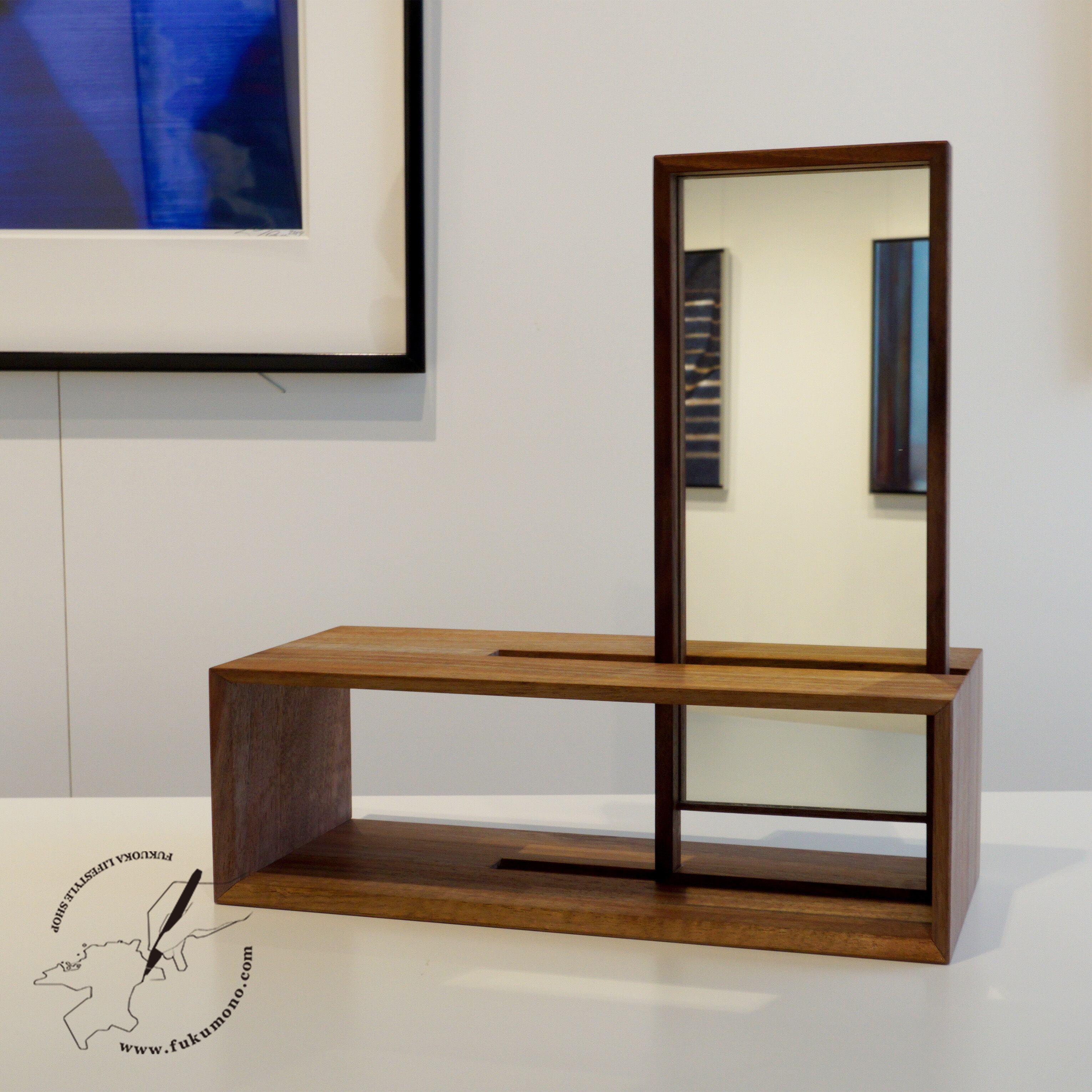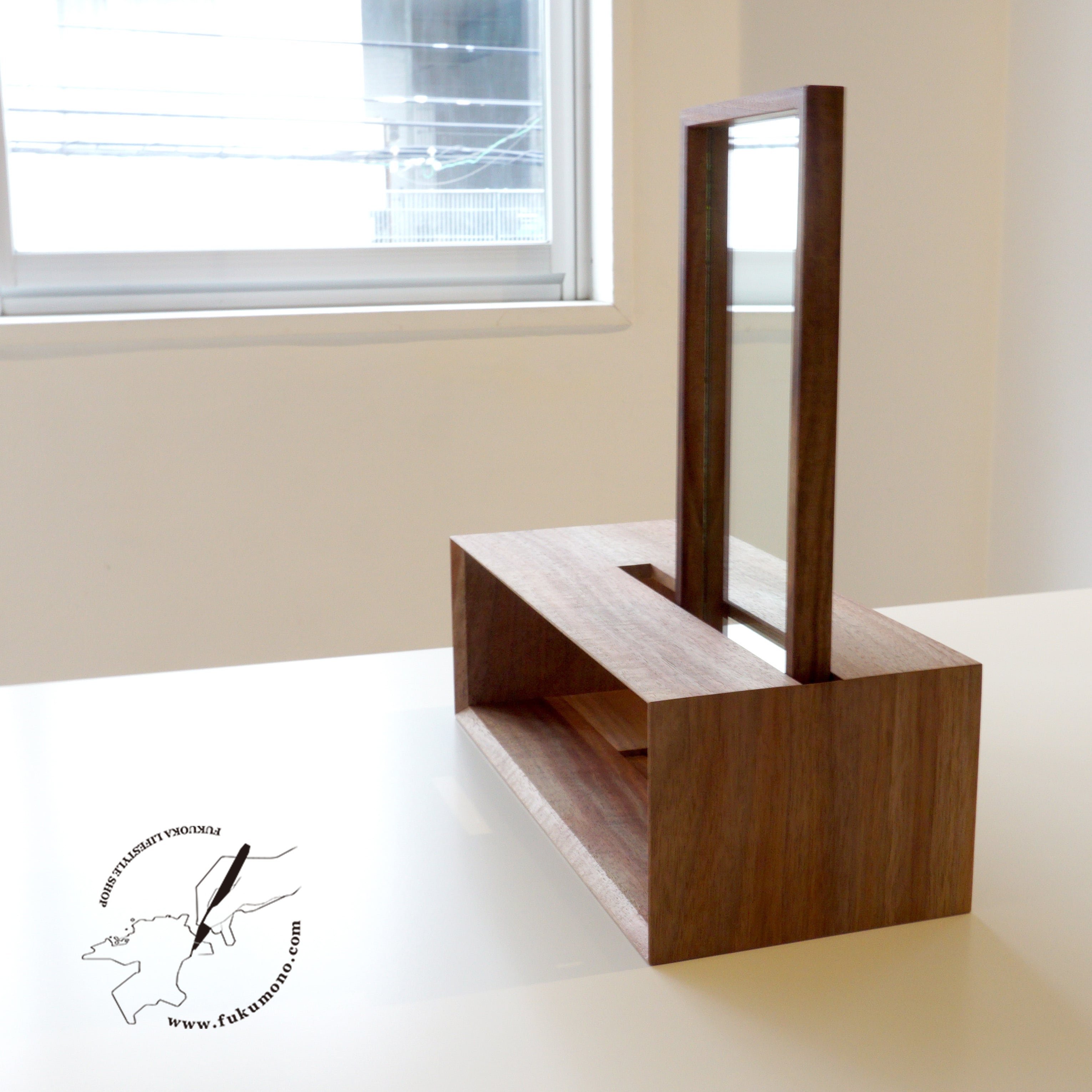 ロングミラーは鏡をセッティングする溝部分に化粧道具等を吊るして保管することも可能で、シンプルなデザインの鏡台の装いです