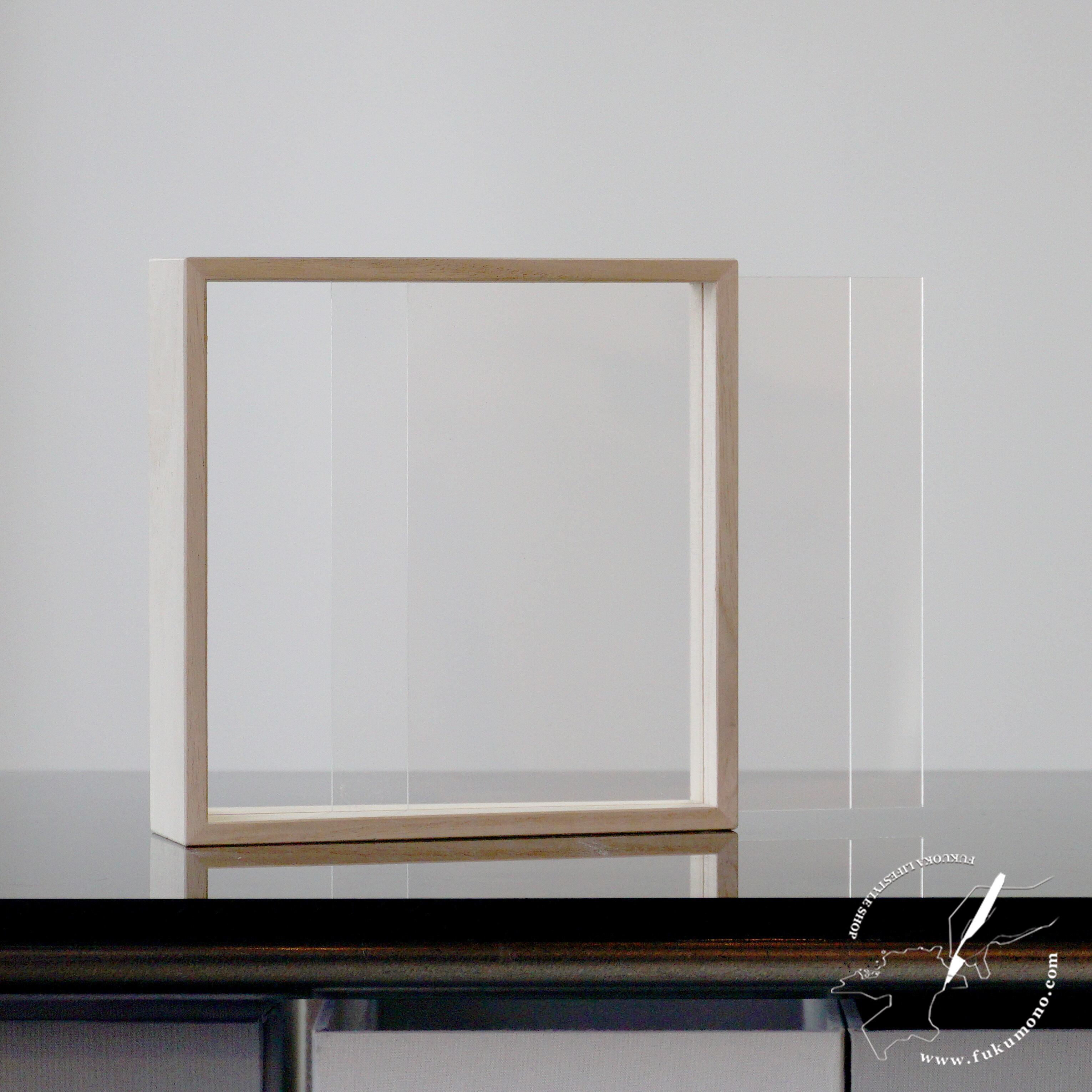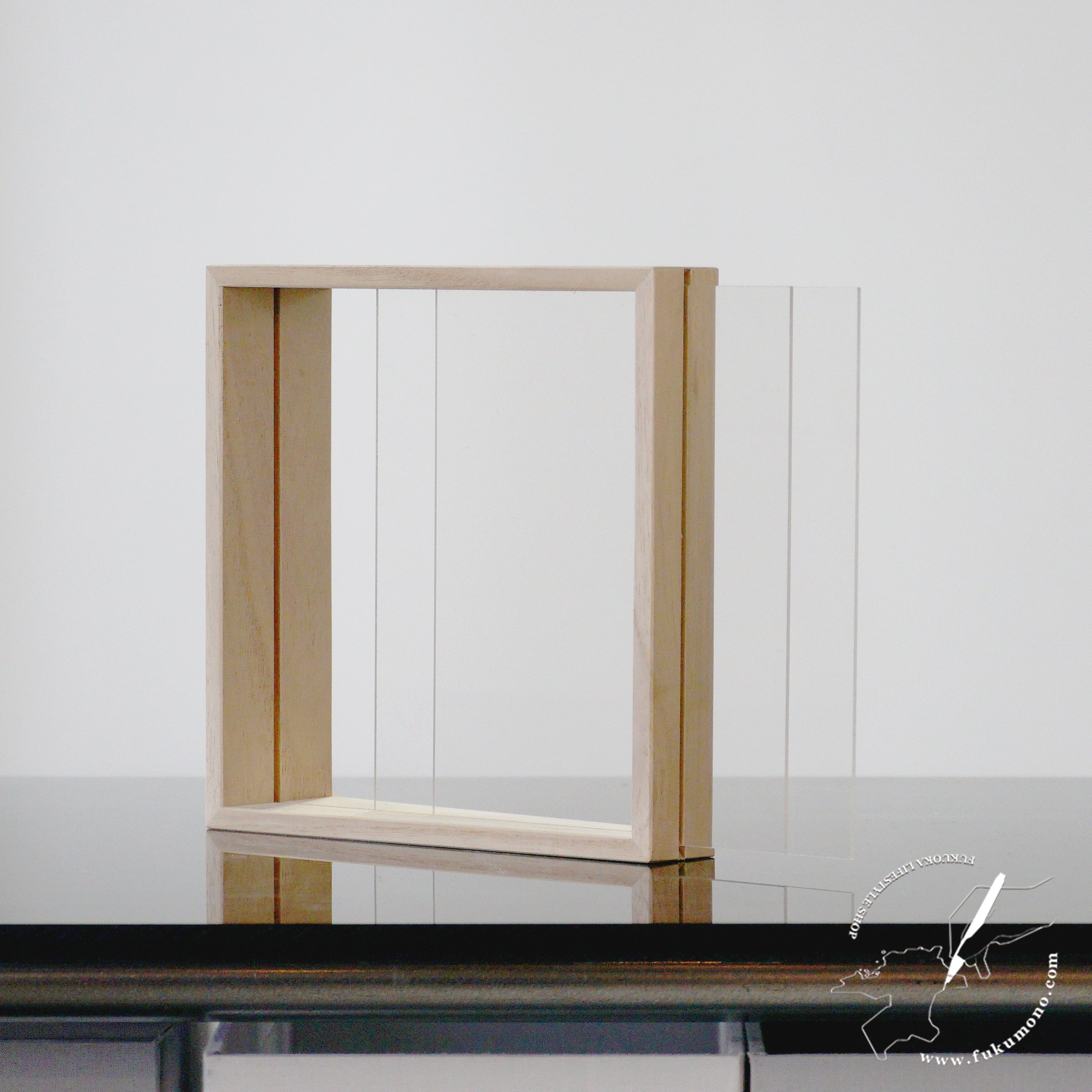 透明度の高いアクリル板2枚で写真・ポストカード・アートを挟み込む仕組みになっています